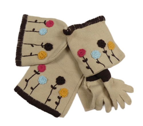 Nové - 4set - Béžová čepice s kytičkami + šála + rukavice + kabelka