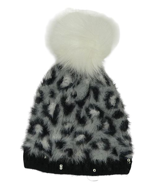 Šedo-bílo-černá vzorovaná chlupatá čepice s flitry a bambulí Monsoon
