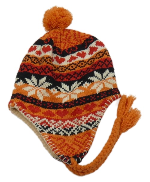 Oranžovo-černo-červená pletená čepice s norským vzorem a bambulí