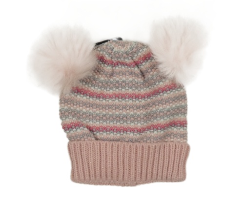 Růžovo-stříbrná pruhovaná čepice s bambulemi