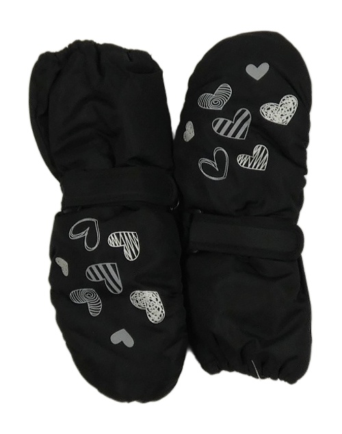 Černé šusťákové palcové zimní rukavice se srdíčky