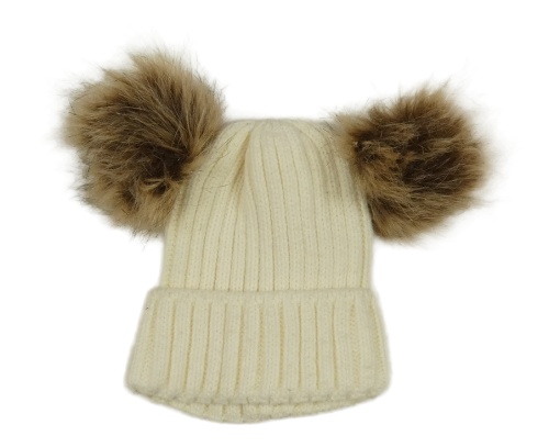 Smetanová pletená žebrovaná čepice s bambulemi