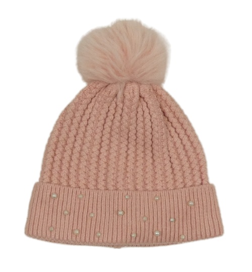 Světlerůžová žebrovaná úpletová čepice s perlami a bambulí Topolino
