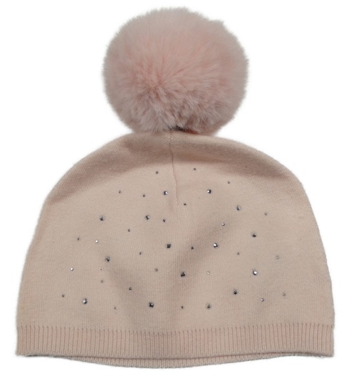 Světlerůžová úpletová čepice s kamínky a bambulí