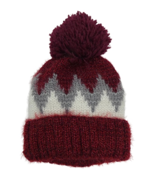 Červeno-bílo-šedá pletená zateplená čepice s bambulí