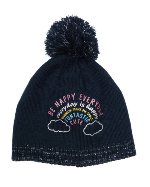 Tmavomodro-stříbrná čepice s duhou z nápisů a obláčky a bambulí