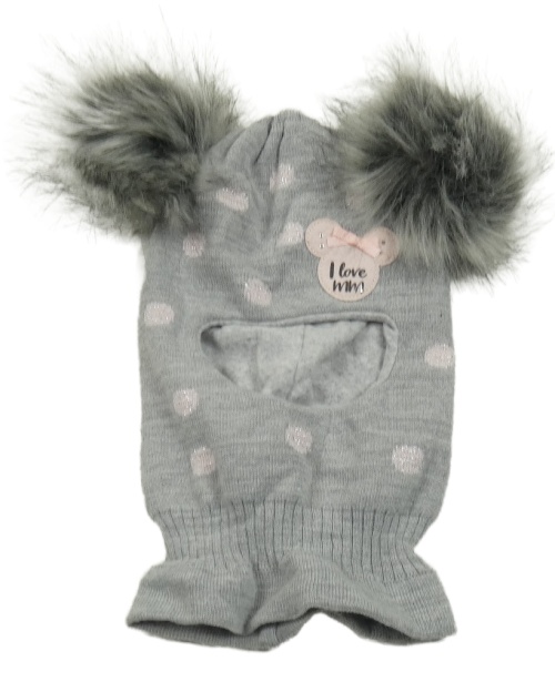 Šedá melírovaná puntíkatá vlněná kukla s Minnie a bambulemi