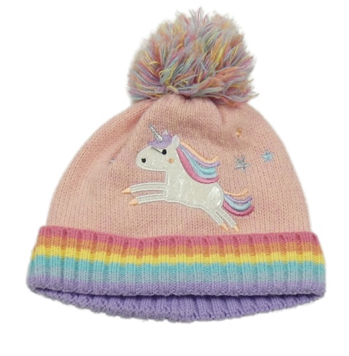Růžovo-barevná melírovaná pletená čepice s jednorožcem a bambulí