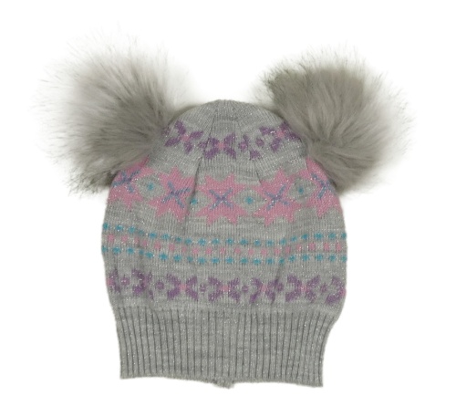 Šedo-růžová vzorovaná pletená čepice s bambulemi