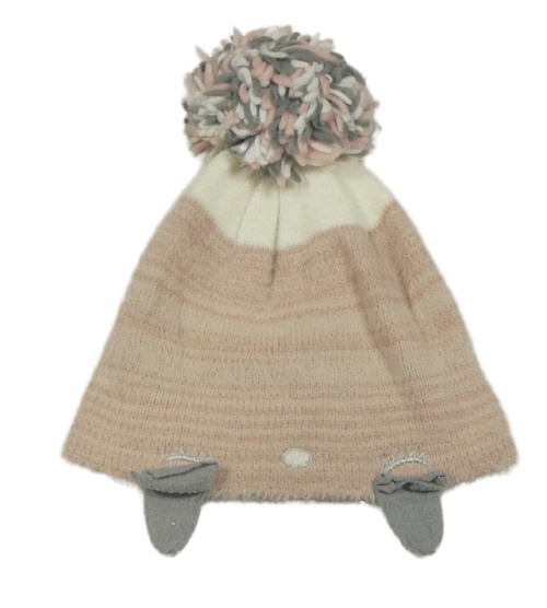 Starorůžovo-smetanová pletená čepice s šedou bambulí