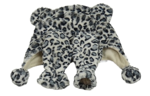 2set - Bílo-šedo-černá kožešinová čepice s leopardím vzorem a oušky + palcové rukavice