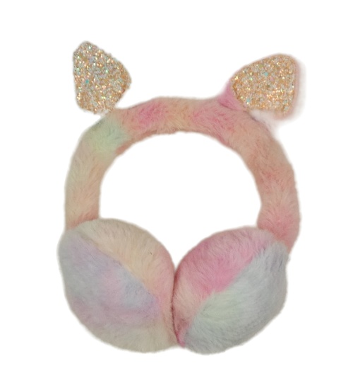 Růžovo-duhové chlupaté klapky na uši s oušky s flitry
