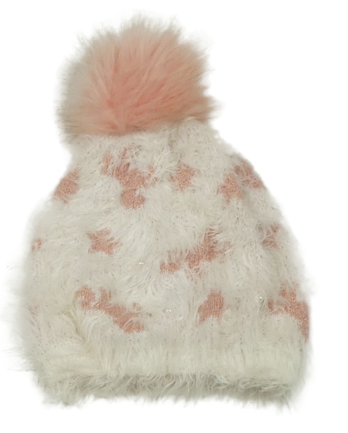 Smetanovo-světlerůžová chlupatá čepice s jednorožci a korálky a bambulí dopodopo