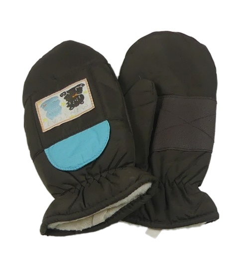 • Tmavohnědo-azurové šusťákové zimní palcové rukavice s nášivkou s koťátky