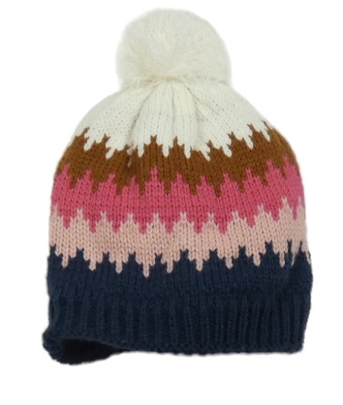 Tmavomodro-světlerůžovo-tmavorůžovo-hnědo-bílá pletená zateplená čepice s bambulí