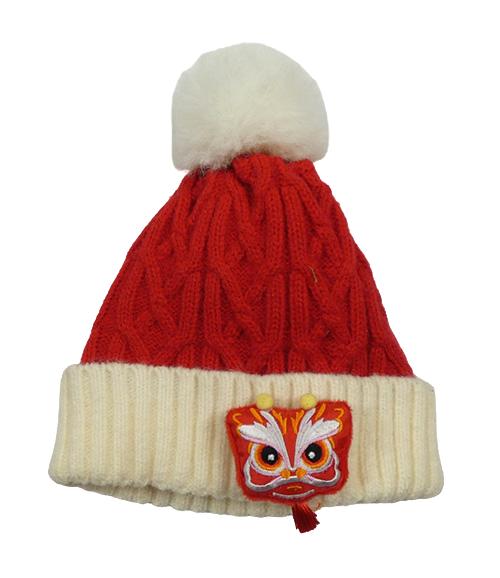 Červeno-smetanová pletená čepice s drakem a bambulí
