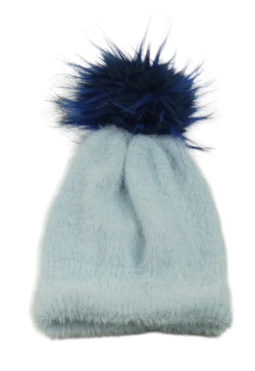Světlemodrá pleteno/chlupatá čepice s bambulí