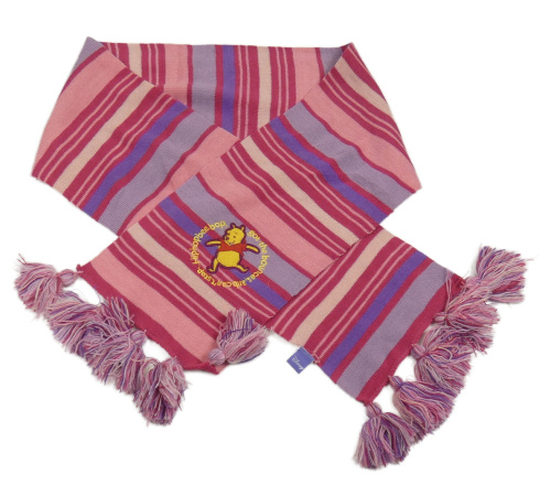 Růžovo-fialová pruhovaná pletená šála s Púem a třásněmi