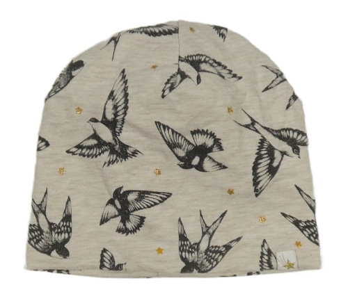 Béžová melírovaná bavlněná čepice s ptáčky