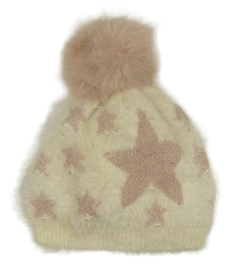 Smetanová chlupatá podšitá čepice s hvězdičkami a bambulí