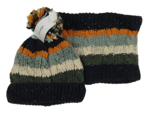 Nové - 2set - Pruhovaná pletená podšitá čepice s bambulí + nákrčník George