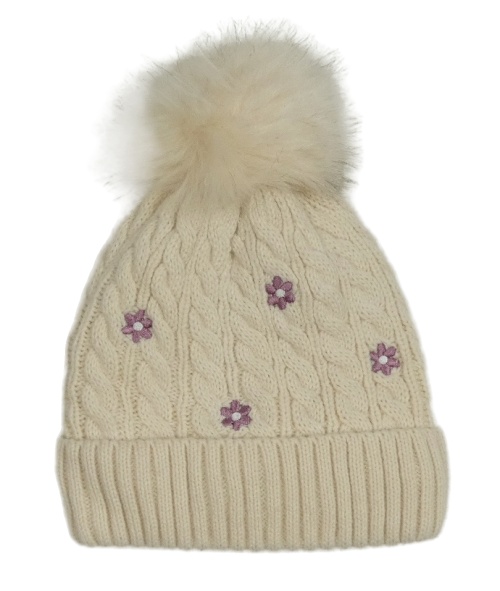 Smetanová vzorovaná pletená čepice s květy a bambulí C&A