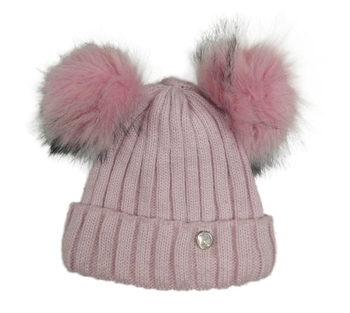 Světlerůžová pletená žebrovaná podšitá čepice s bambulemi