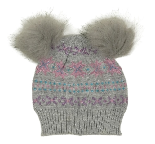 Šedo-růžovo-modro-fialová vzorovaná čepice s bambulemi