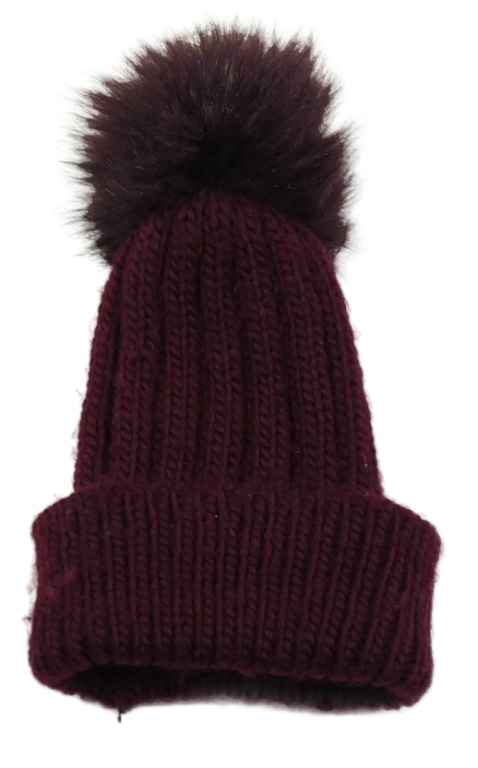 Tmavovínová žebrovaná pletená čepice s bambulí