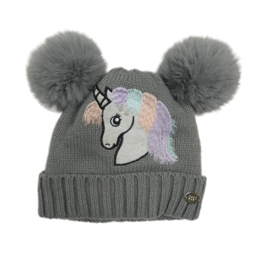 Šedá čepice s jednorožcem a bambulemi