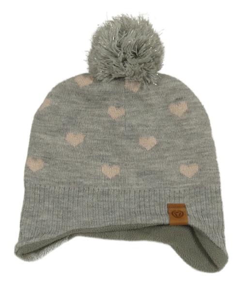 Šedá pletená podšitá čepice se srdíčky a bambulí
