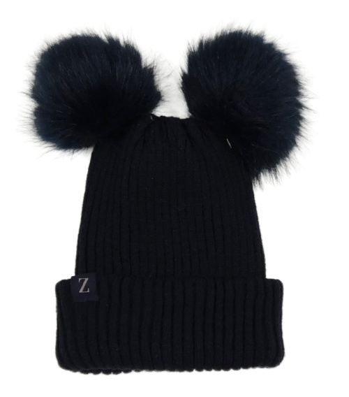 Tmavomodrá žebrovaná čepice s nášivkou a bambulemi