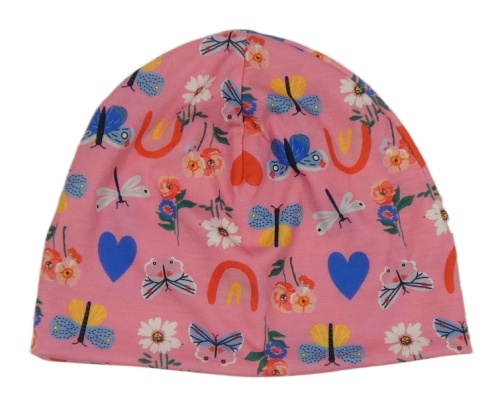 Růžová čepice s květy a motýlky