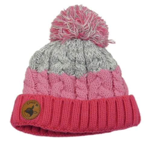 Růžovo-šedá pruhovaná copánková podšitá čepice s bambulí Kiki&Koko