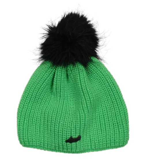 Neonově zelená třpytivá čepice s nášivkou a bambulí