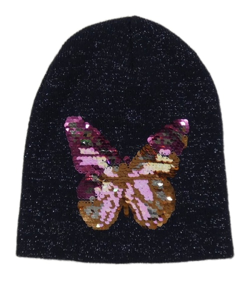 Tmavomodrá třpytivá pletená čepice s motýlem z překlápěcích flitrů H&M