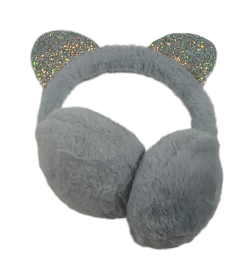 Šedé kožešinové klapky na uši s oušky s třpytkami