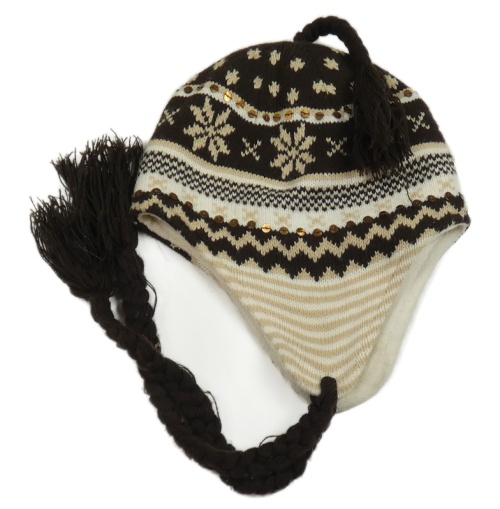 Kávovo-béžová vzorovaná čepice s flitry a třásněmi