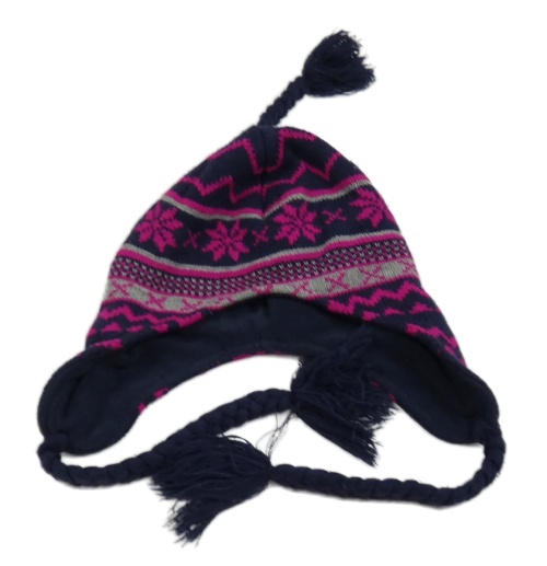 Tmavomodro-fuchsiovo-šedá vzorovaná čepice s třásněmi