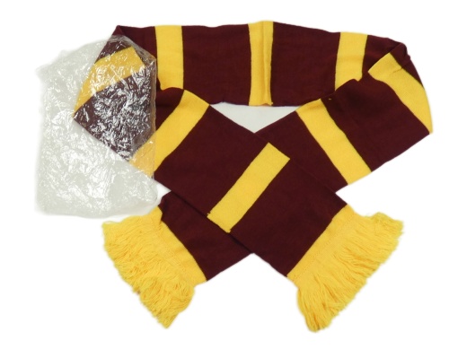 Nové - vínovo-žlutá pruhovaná pletená šála s třásněmi