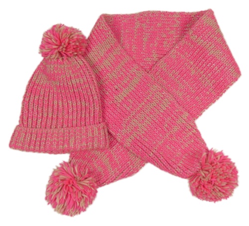 2set - Neonově růžovo-růžová melírovaná šála s bambulemi + čepice M&S