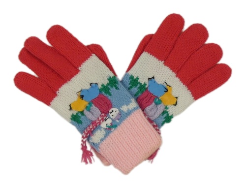 Nové - světlerůžovo/světlemodro-bílo-červené pletené prstové rukavice s lidmi