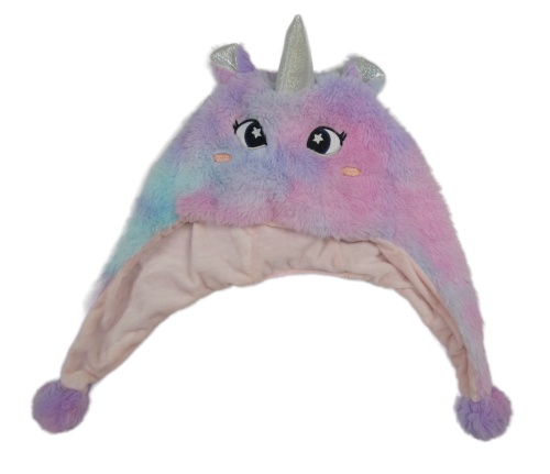 Růžovo-modrá kožešinová čepice s rohem - jednorožec