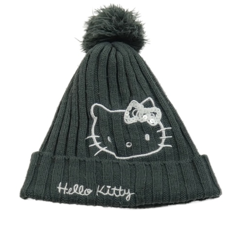Tmavošedá žebrovaná pletená čepice s Kitty s flitry a bambulí