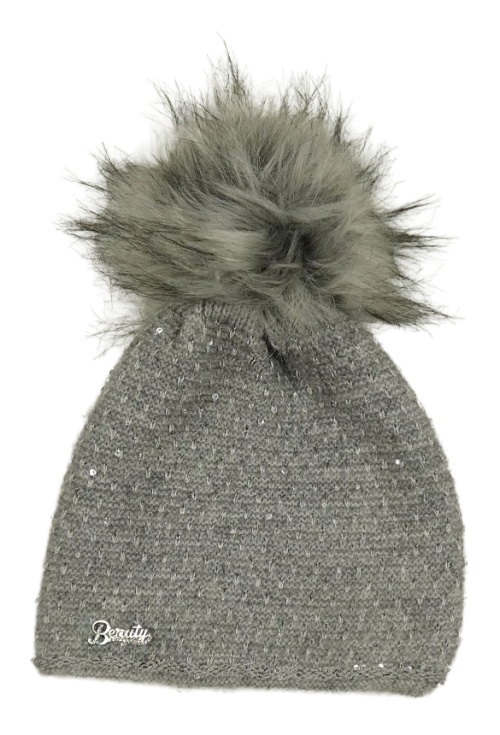 Šedá melírovaná vlněná čepice s flitry a bambulí