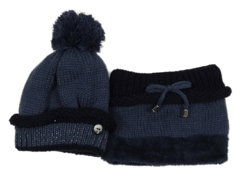 2set - Tmavomodrá pletená čepice s bambulí + nákrčník