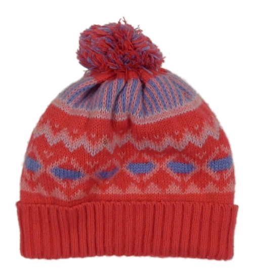 Jahodovo-modro-růžová vzorovaná pletená zateplená čepice s bambulí