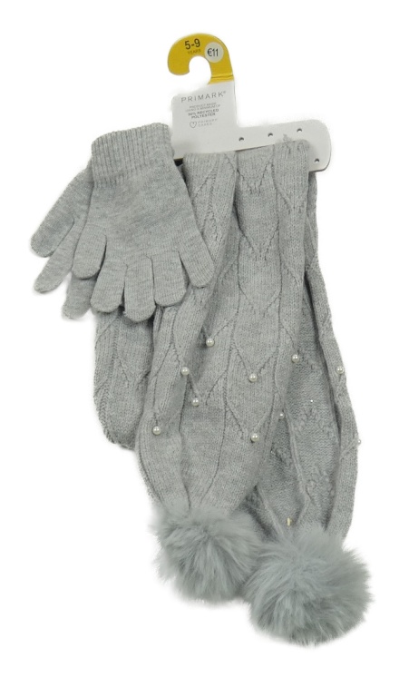 • Nové - 2Set - Šedá melírovaná žebrovaná vzorovaná šála s perlami a bambulemi + prstové rukavice PRIMARK