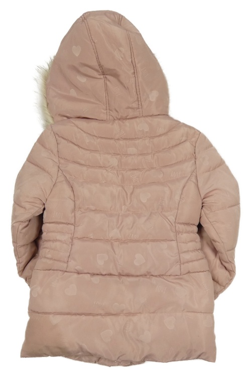 • Světlerůžový prošívaný šusťákový zimní kabát se srdíčky a nápisy a kapucí s kožešinou ORCHESTRA