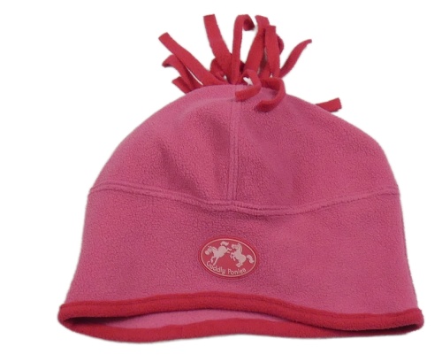 Tmavorůžová fleecová čepice s nášivkou a třásněmi